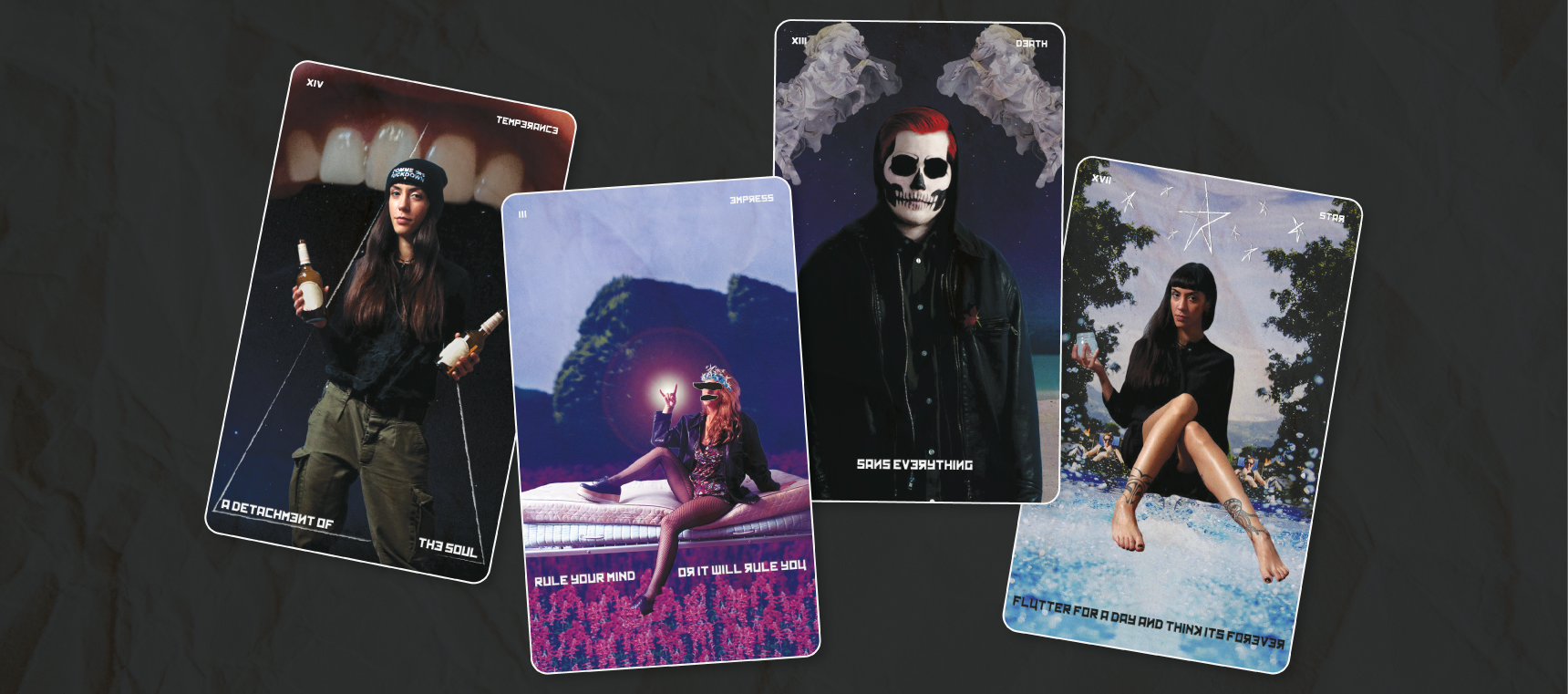 Digital collage tarot cards, incorporating symbolism, surrealism, shakespearean and punk elements.